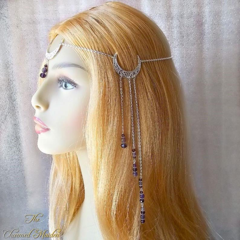WiccMoon Circlet, Pagan Headdress Wiccan Head Chain Moon & Triskele Headpiece Gothic Head Chain